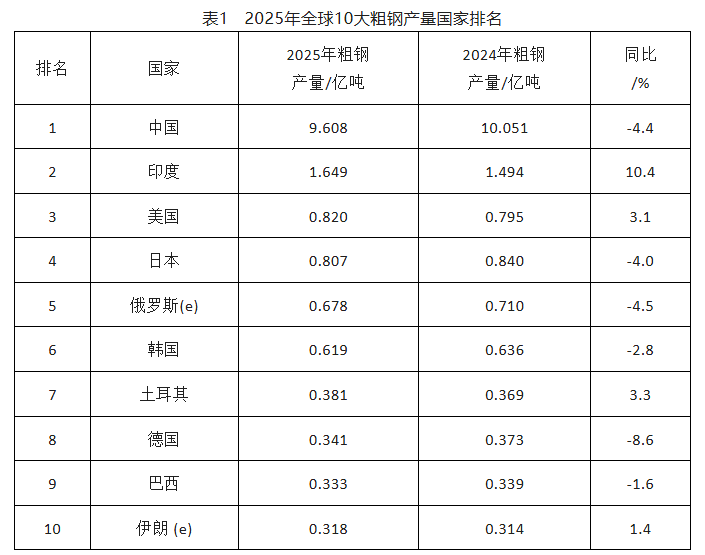 2025年全球10大粗鋼產(chǎn)量國家排名如表1所示。其中排名前三位的國家為中國、印度、美國,中國粗鋼產(chǎn)量9.608億噸,同比下降4.4%;印度粗鋼產(chǎn)量1.649億噸,同比增長10.4%;美國粗鋼產(chǎn)量8200萬噸,同比增長3.1%。其中粗鋼產(chǎn)量同比正增長的國家為印度、美國、土耳其、伊朗,增長率分別為10.4%、3.1%、3.3%、1.4%,其余為負增長。