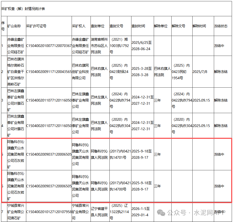 其中,阿魯科爾沁旗鑫天山水泥集團(tuán)有限公司石灰?guī)r礦被阿魯科爾沁旗人民法院查封,查封時(shí)間三年,為2025-9-18至2028-9-17。